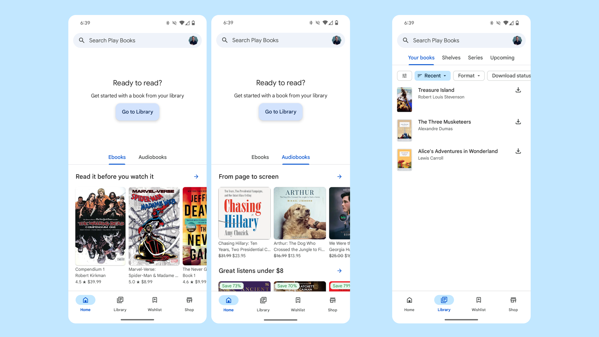 In Google Play Books, tabs are used on the "home" screen to categorize different types of books (ebooks and audiobooks), and in the user's Library, tabs offer different presentations of the same content.