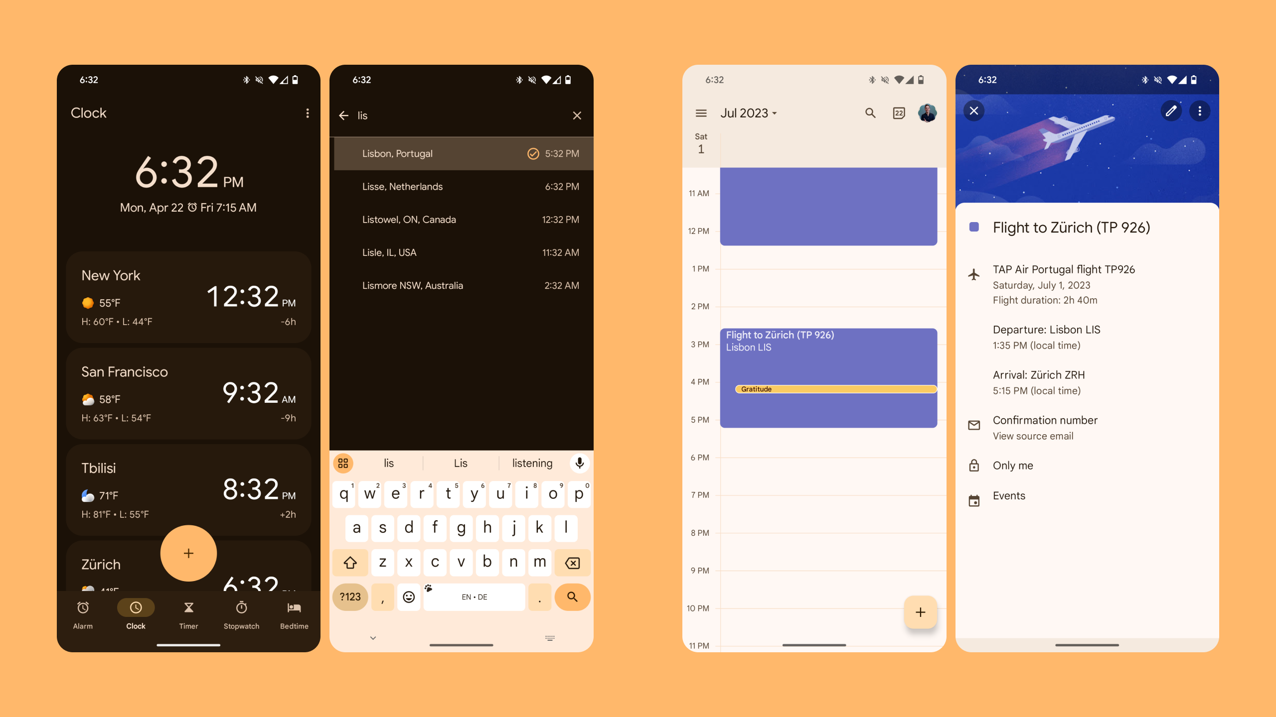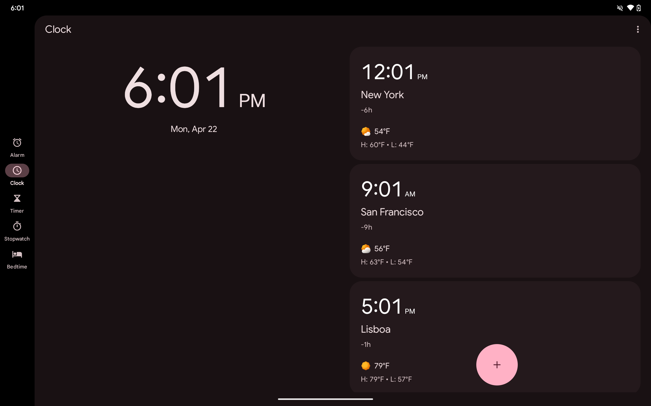In the Clock app (above, left), the FAB navigates to a search view to select a new city, linking the user to part of the "add a city" task that itself is not directly subsequent to any specific destination.