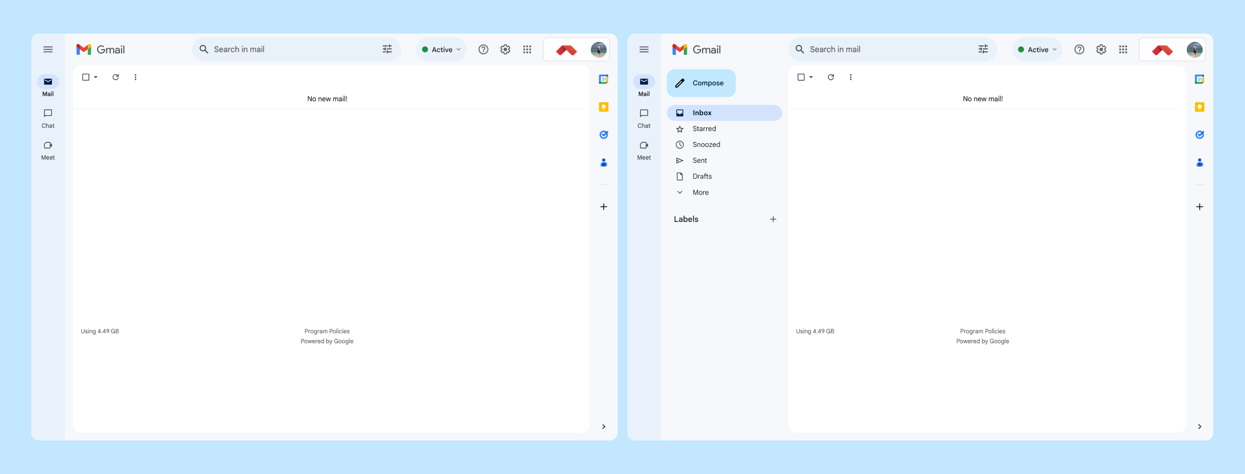 The navigation rail can take on more complicated embodiments, though. For example, in Gmail, it is attached to a specialized navigation drawer (discussed later). This expanded view maintains the primary destinations while revealing a secondary list of destinations.