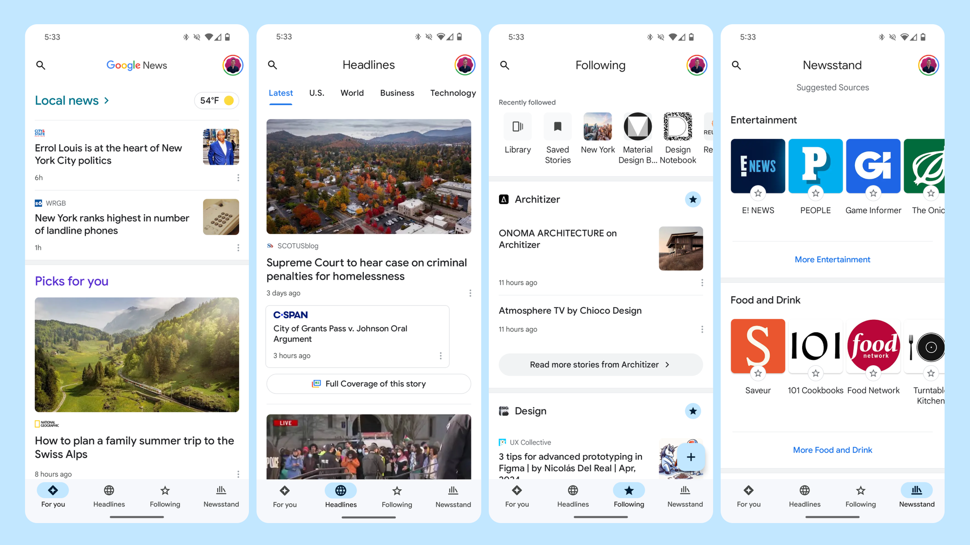 Google News uses the navigation bar in a very straightforward way, and manages to keep all of its top-level destinations there.