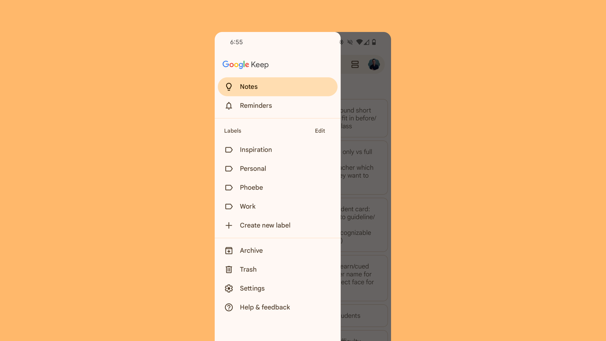 Google Keep relies on a navigation drawer for primary, secondary, and supporting destinations.