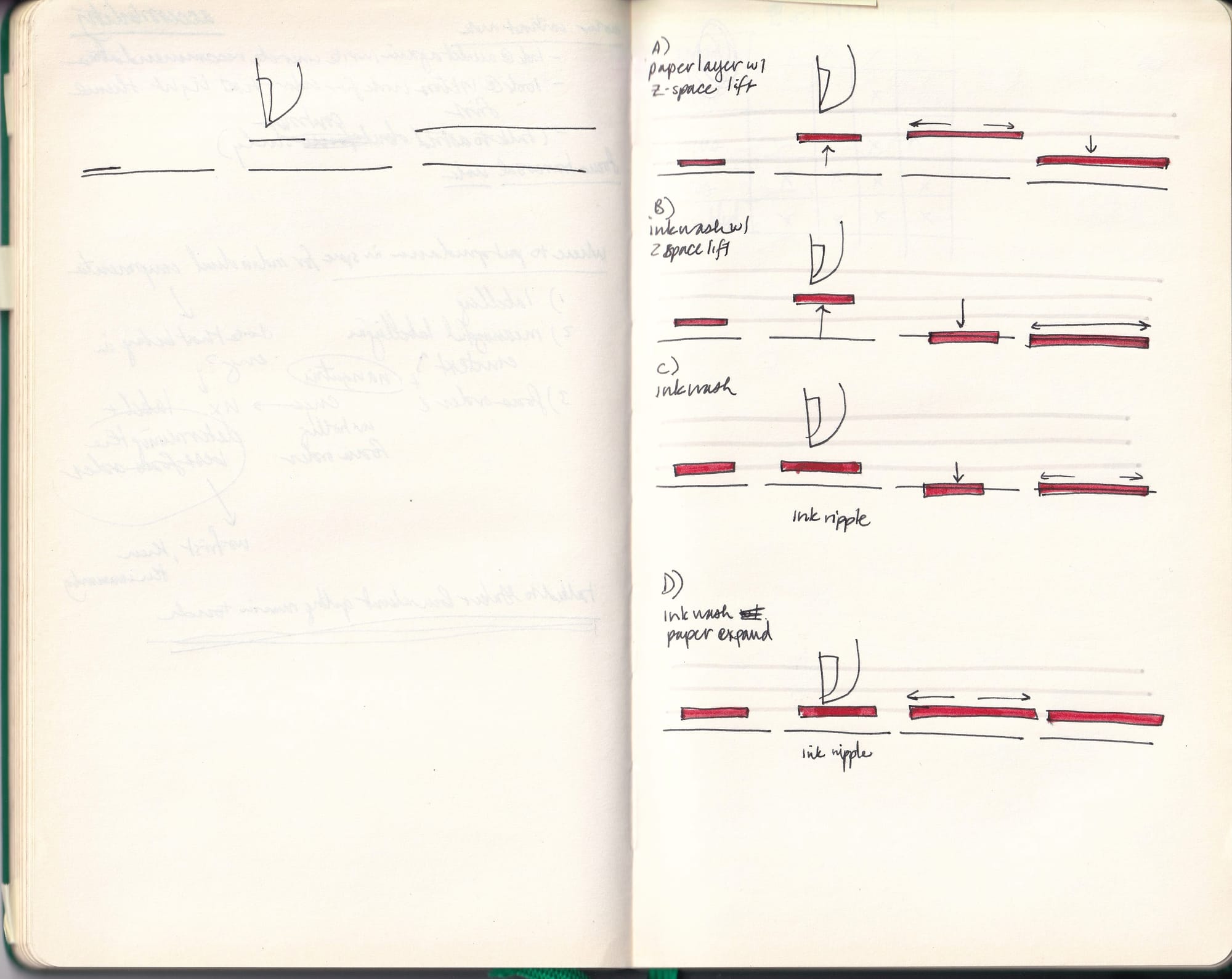 Bethany: Um, well, I've ... Yeah, I mean, you're absolutely right, that being hands on and the tactility of making things has always been an important part of my process and it seemed to be a really key part of everyone's process when we were making Material. Everyone toted around our own little notebooks. We were all sketching furiously at any given moment, um, is very natural for, you know, in a design crit, someone to hold up their, their notebook and, and show their page. Everyone be like, "And, and this is how I would synthesize that idea." And there was a real, um, like, fluidity and ability to articulate visually, which I think is a little bit lost right now.I mean, we've ... I mean, with the rise of remote-first work and we're often not co-located in the same place, um, it's, it's become more important that you have to communicate your thoughts, um, digitally basically immediately. And so going to that sketchbook as, like, a first place to work out an idea, I, I think, isn't as, as natural anymore. Um, it feels faster to just go to the Figma or go to the Google Doc and, and start writing things out or attempting to, to sketch things out in whatever, um, you know, Google Sites (laughs) or what have you, which is super tough.Um, I, I still think that tactile exploration is important. I think I, I haven't been able to kind of thread the needle for how we get from, um, or how we more readily prototype experiences in space. I think of all the spatial computing paradigms that are becoming much more mainstream quickly, and yet there is, uh, an inability for designers to articulate their thoughts about those spaces very quickly right now. Um, I mean, just as we're talking, it's striking to me, I have not yet seen any designer ... I mean, maybe I'm uninformed, but I haven't seen any designer even, like, hang sheets of paper around their workspace or their face in order to try and understand, like, what feels comfortable, what's legible, what's readable at certain distances. All of the prototyping has been digital or involves, like, putting a headset on and off your face, um. And so I think, you know, maybe there's, maybe someone's tried it and it just hasn't worked. But if we're going to be moving into an age of, of spatial computing, then I think it would behoove us to understand first how space works and how, how information in space around us would ideally behave.