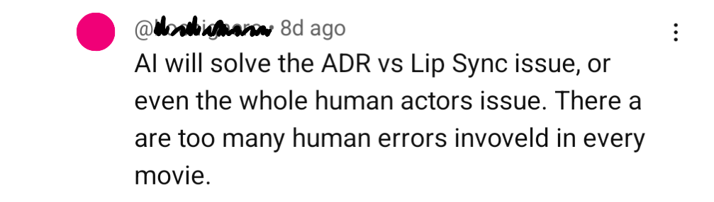 But what’s interesting to me here is not whether or not AI (or any technology) can rid us of human error. What’s interesting is what we consider human error and—for each of the numerous answers—what overarching impulse drives us to get rid of it in the first place. In the screenshot above (taken from a video about why Madame Web is such a weird movie), the central idea is “the whole ‘human actors’ issue.” It is the idea that human actors are too unpredictable, too susceptible to flaws in performance, and too inefficient to create a perfect movie. According to the commenter, that will finally be possible using AI. Absent from this line of thinking is any description of what a movie perfected by AI would be like or what—if anything at all—we might experience when we watch it.