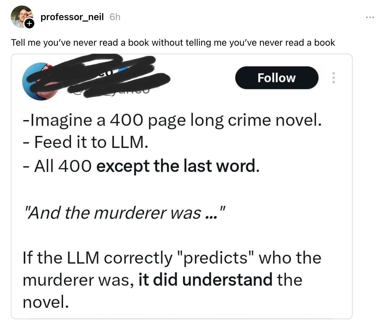 Finally, a post on Threads that caught my eye: the original poster is proposing that you could feed every word of a crime novel (except the end) into an LLM and test whether it “understands” the plot by asking it to tell you who the killer is. Leaving aside the question of what it would even mean for a computer to “understand” that kind of information, replies on Threads correctly point out that the original post frames the novel as essentially a math problem. Assuming all the other pieces are there, an entity is successful in engaging with the work if it can successfully produce the one teeny tiny little cog (a single word!) that’s missing, completely missing the point of reading (or writing) a book in the first place. It evokes a vision of the world in which pushing a button can create concrete, well-understood and—most importantly—accurate or undoubtable answers.