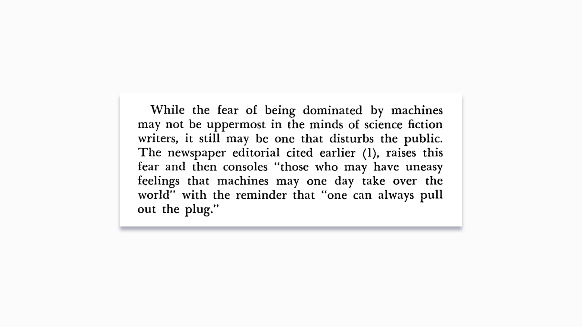 The piece offers a fun, comprehensive review of dozens of instances of fictional computers from the past (especially impressive given the year it was published), dividing the themes of the stories in which these computers exist into categories that—I think—still ring true in today’s preoccupations: