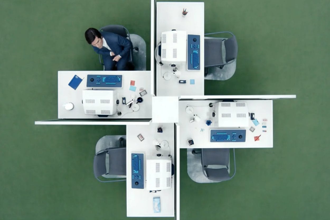 The office in the show is cartoonishly clinical, conveying the same absurd-yet-a-little-too-real portrayal of work at a large company as something like the Music Dance Event. The white halls of the office are so uniform they could be procedurally generated. The cubicles are modular. Workers sit on chairs with steel tube frames.