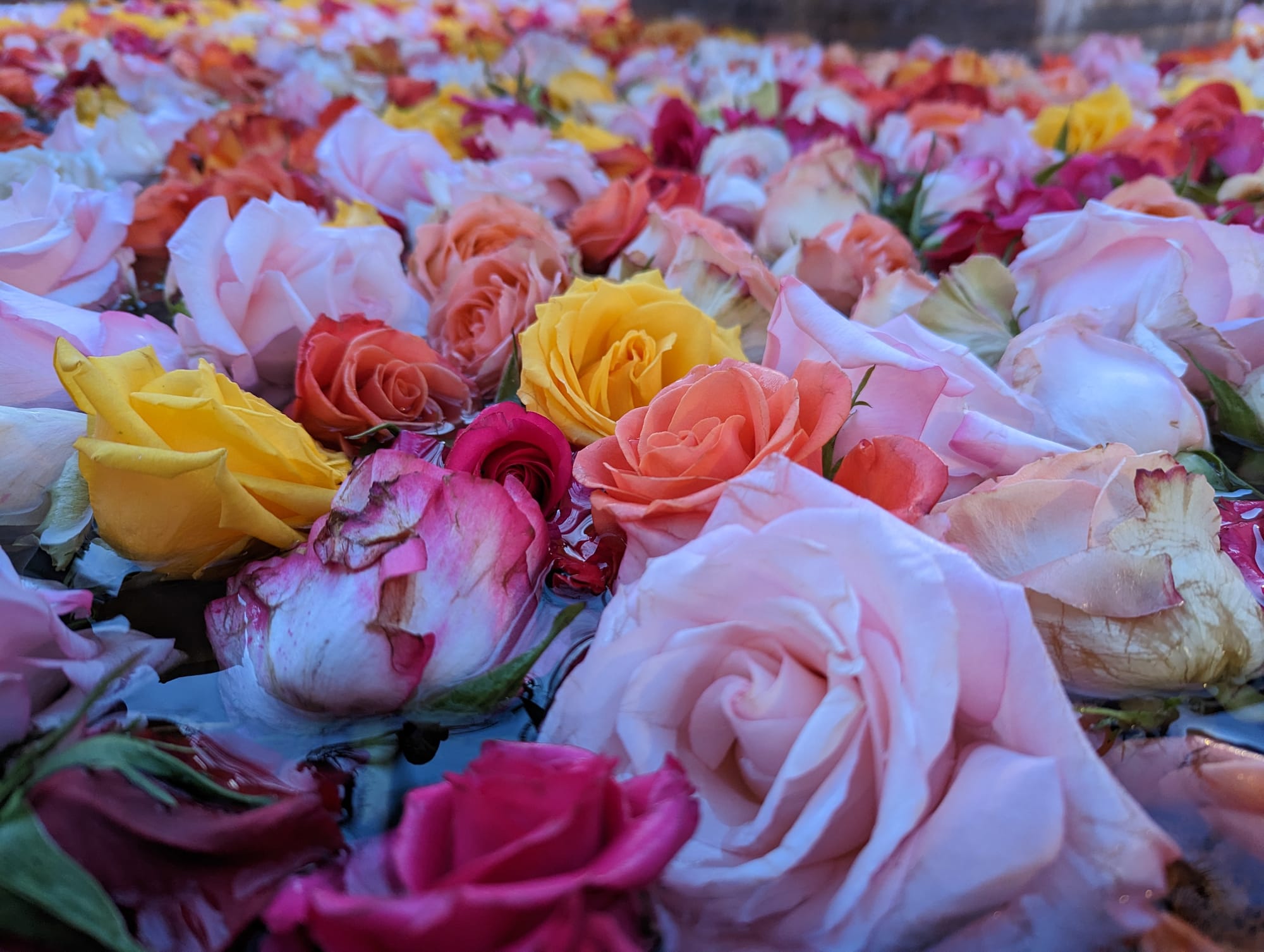 On a cloudy early-autumn morning in Zürich, at the edge of the Altstadt, not too far from where I live, hundreds of huge, dense rose blossoms are being cut from their stems. The red, orange, yellow, pink, and white flowers, each nearly as big as a tennis ball, are gathered up and dumped into the clear water of an octagonal pool at the corner of the Prediger church next to Zürich’s central library. The heavy rose blossoms bob with improbable ease at the top of the water even as two long spouts, jutting from the sides of a central column, babble streams of water down to the pool below. On top of the column, about three meters off the ground, there sits a statue of a boy riding on top of a giant frog and carrying a banner. This is the Froschauerbrunnen or Froschauer fountain in English.