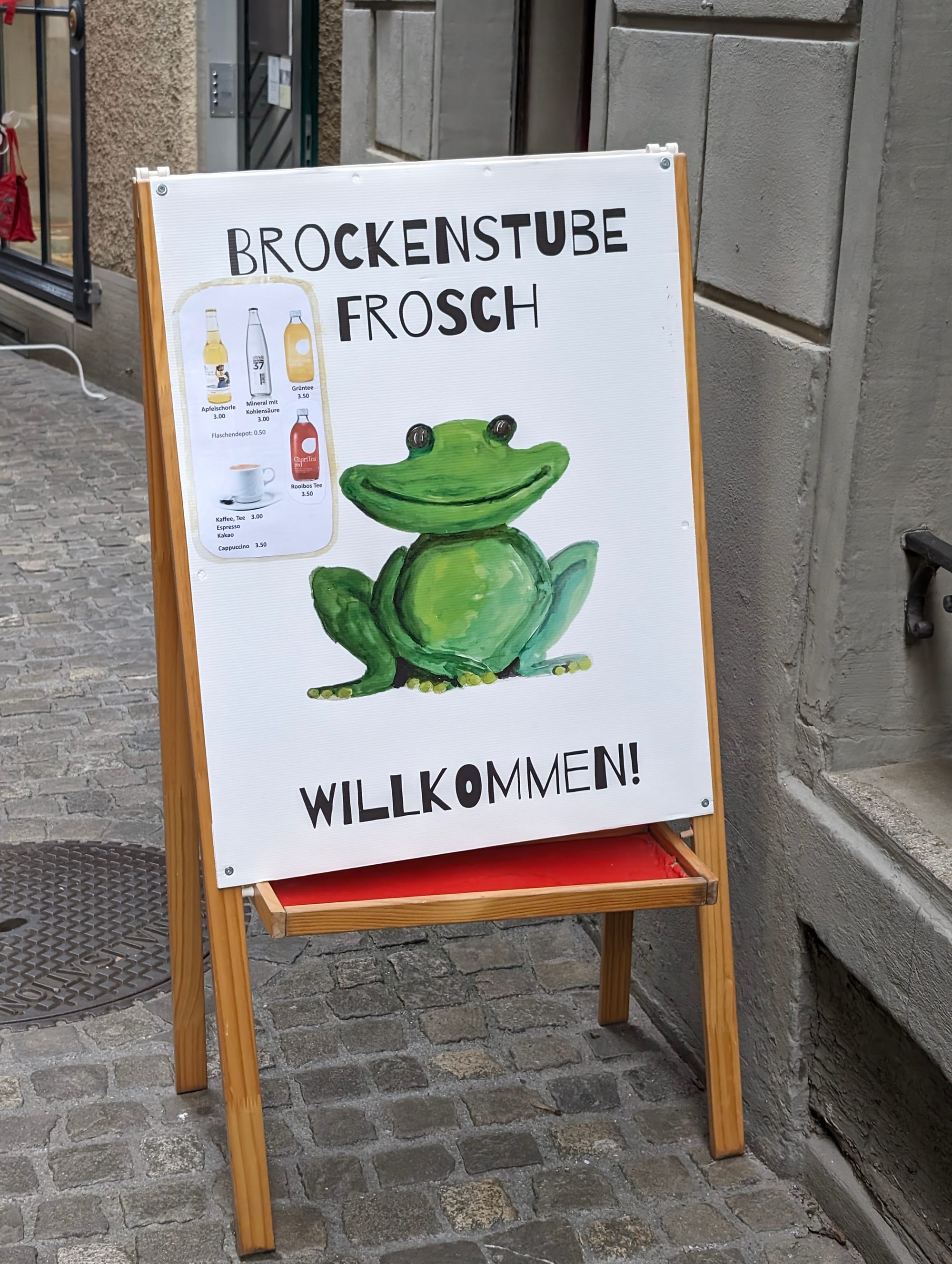 The boy riding the frog is a symbol for Christoph Froschauer, whose name is shared by the fountain itself and whose frog signet (“Frosch” in German) is the motif of several nearby shops along the Froschau-gasse (Froschau alley). Froschauer’s sixteenth-century printing operation in Zürich was responsible for the first printing of the Zwingli Bible translation—the book’s first full translation to German—and thus part of the history of the Reformation in Zürich, which would spread across Switzerland. The printing house would eventually evolve into the Swiss printing giant Orell-Füssli, responsible not just for books but for printing Switzerland’s banknotes as well.