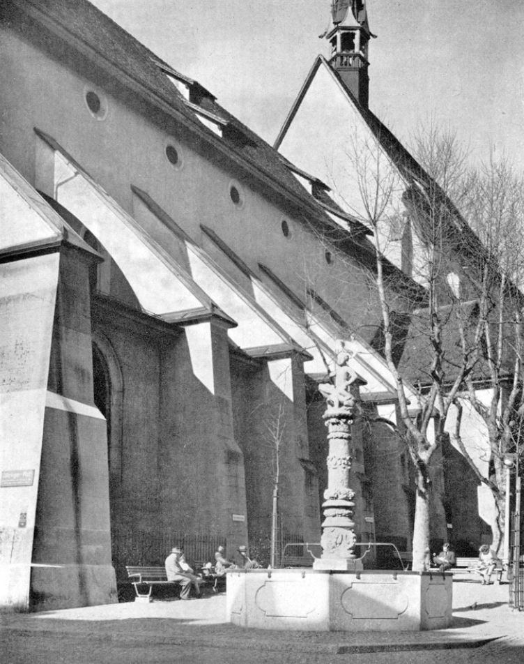 The Froschauerbrunnen’s original sculptor, Balthasar Bingiser, erected the central column of the fountain in the former cloister fifty-four years later, in 1585, on commission from Froschauer’s nephew, who had taken over the printing operation after his uncle’s death. The printing house’s main operations were by then located in the former Convent of St Verena—now the Frosch Cinema—which had been acquired by Froschauer in 1551.
