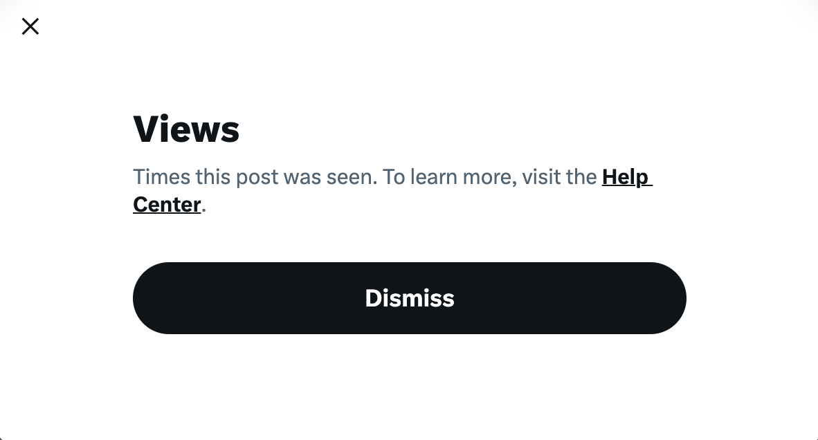 Coming back to the present, we see that the view count is not just conceptually void of action, but literally affords no action on the screen. Styled to be identical to the other options under a tweet, it suggests affordance. But the only thing the view count affords is a larger view of the same information or an unhelpful dialog that explains what the number next to “views” means (it means, unsurprisingly, views).